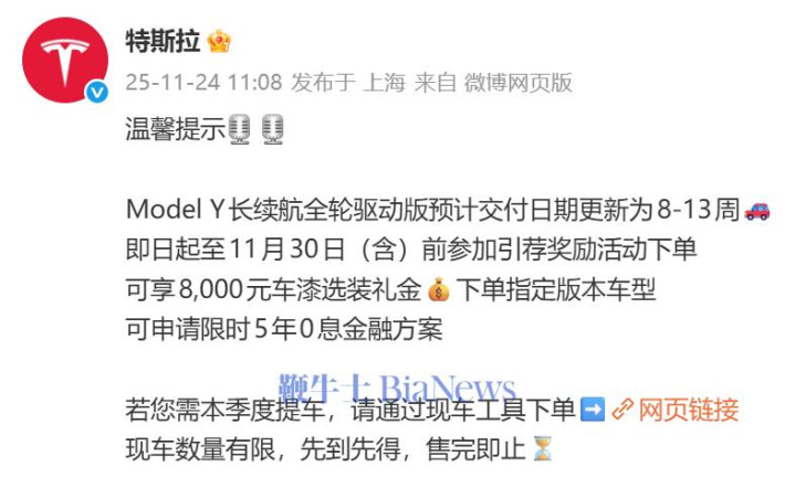 即日起至11月30日(含)前参加引荐奖励活动下单,可享8000元车漆选装礼金,下单指定版本车型,可申请限时5年0息金融方案。