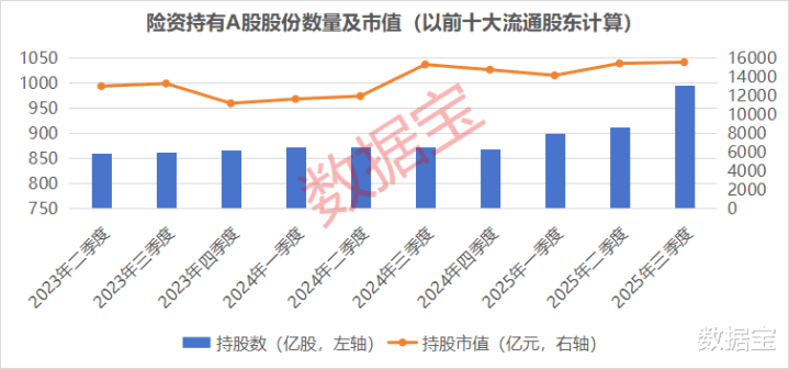 从A股市场来看,以前十大流通股东的持股情况来看(保留中国人寿、平安银行两只大股东为险资的个股),截至2025年三季度末,险资持股数量接近996亿股,持股市值(期末收盘价)达到1.56万亿元,持股数量及持股市值均创近10个季度以来新高,持股数量及持股市值较2023年二季度末增幅均超过15%。